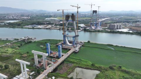 京灶大桥项目建成通车后,将有效解决潮汕地区榕江南河两岸数十万群众交通往来的需求问题。图为京灶大桥主桥施工现场。