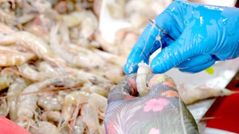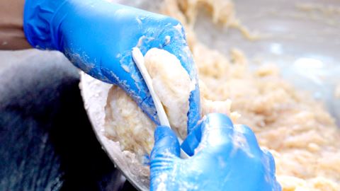 正如林创城所说,传统工艺对此颇有讲究:师傅会将一半虾肉细细拍打成泥,另一半则切成颗粒状。如此搭配,能让成品虾枣既保留虾肉颗粒带来的扎实嚼劲,又兼具虾泥赋予的细腻口感,层次格外丰富。调味环节追求“少而精”,仅加入少许白糖、盐与味精,便能最大程度激发虾肉本身的鲜甜。接着打入鸭蛋清,其作用是帮助虾浆更好地起胶,让虾枣入口更显弹牙。此外,每10斤虾肉中还需加入7两白肉丁,这一配比能进一步提升虾枣的软嫩度,让口感更显饱满。
