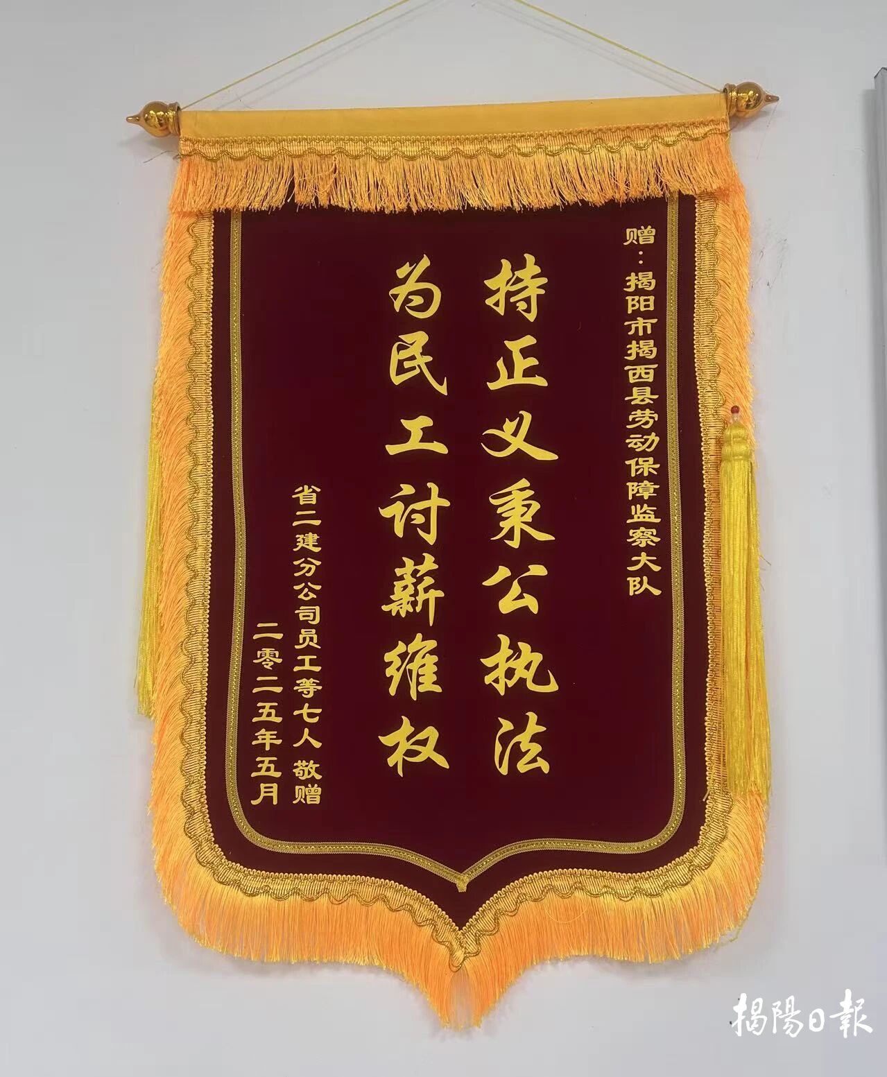 揭西县人社局收到群众赠送的写着“持正义秉公执法,为民工讨薪维权”的锦旗。