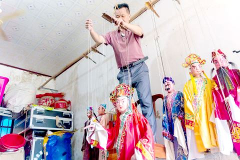 提线木偶艺人自上而下提拉丝线来控制木偶做出各种动作,以精湛技艺赋予木偶鲜活的姿态和丰富的情感。