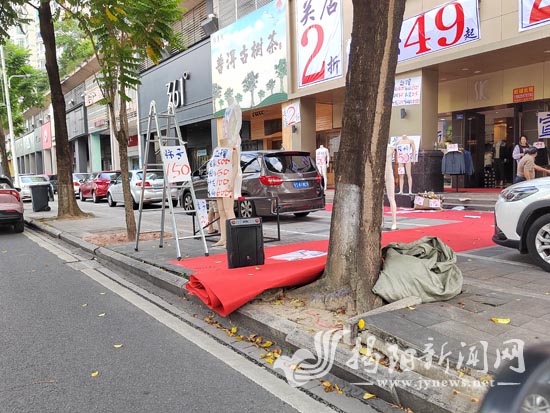 这家服装店墙上张贴着“关店2折”等醒目的促销字样,门口人行道上杂乱地摆放着旧梯子、时装人体模特架等物件。门口的音箱持续播放着摇滚音乐,强烈的声浪扑面而来,令人十分不适。即便走到马路对面,仍能清晰感受到音箱传来的阵阵“音浪”。