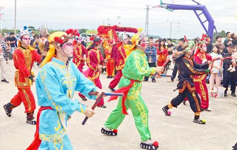 戏台旁的空地上,舞狮表演正燃情开演。金黄与朱红相间的彩狮随着鼓点腾跃翻滚,“金狮献瑞”“雄狮踩桩”等高难度动作引得观众纷纷举起手机拍摄记录,当彩狮吐出写着“国泰民安”“风调雨顺”字样的吉祥条幅时,现场气氛达到高潮。更令人振奋的是随后登场的英歌舞展演——20多名传统脸谱装扮的舞者,手持双槌随着铿锵鼓点起舞(见图。通讯员 摄),时而如双龙出海阵列齐整,时而如猛虎下山气势磅礴,扮演“时迁”的演员踩着矮子步穿梭引导,将水浒英雄的忠义豪情展现得淋漓尽致,彰显“中华战舞”的独特魅力。