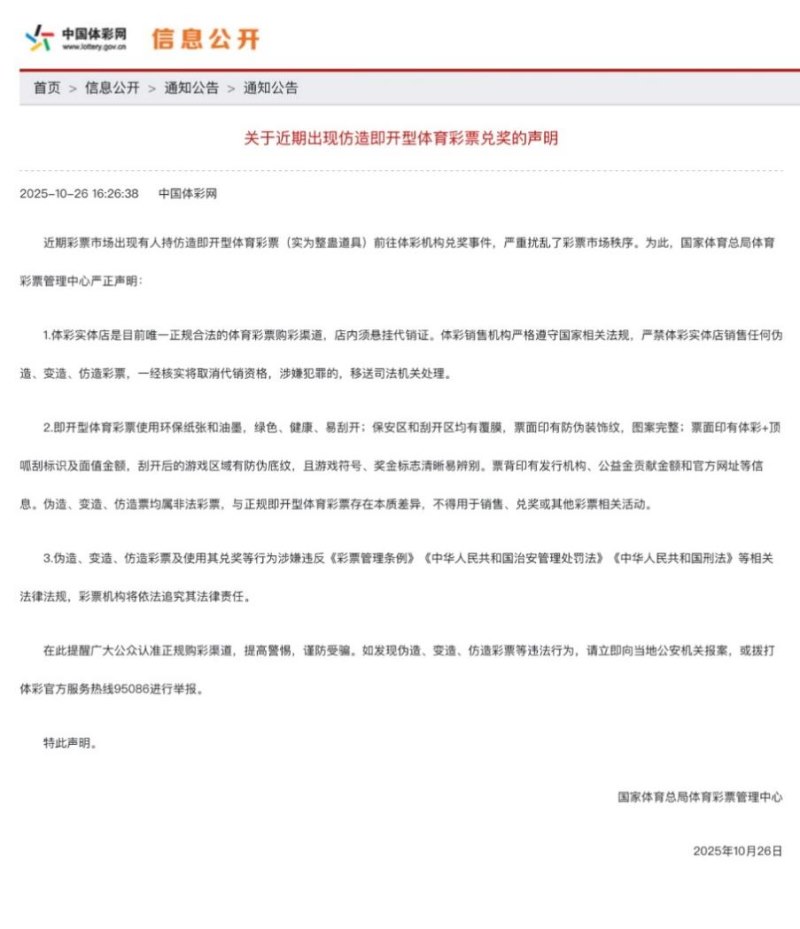 10月28日,央视《朝闻天下》栏目报道了一则关乎每位购彩者切身利益的重要新闻——国家体彩中心正式发布了《关于近期出现仿造即开型体育彩票兑奖的声明》,揭示了近期彩票市场上有不法分子利用仿造的即开型体育彩票(实为整蛊道具)试图在体彩机构进行兑奖,此举不仅严重扰乱了正常的彩票市场秩序,也对广大购彩者的权益构成了潜在威胁。