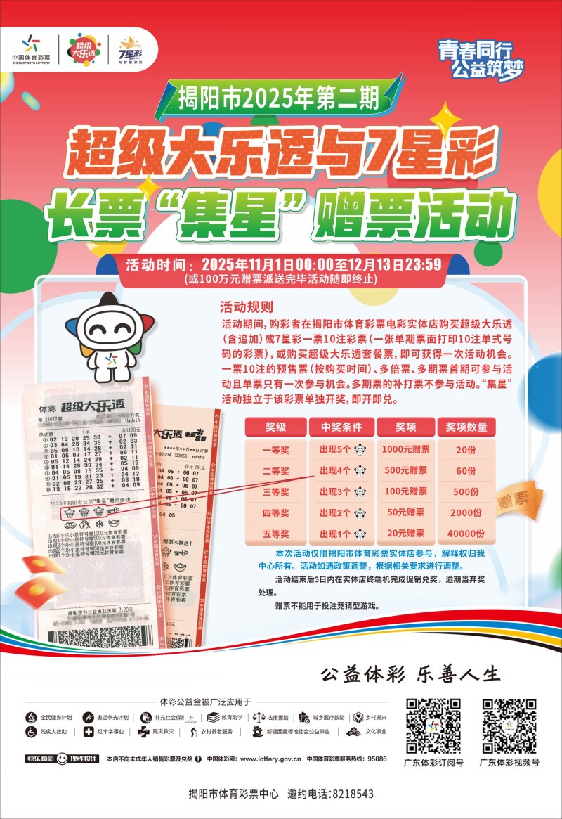为感谢广大购彩者对体育彩票及公益事业的支持与厚爱,揭阳市体育彩票中心于2025年11月1日至12月13日期间,推出揭阳体彩大乐透套餐票100万大赠票活动!