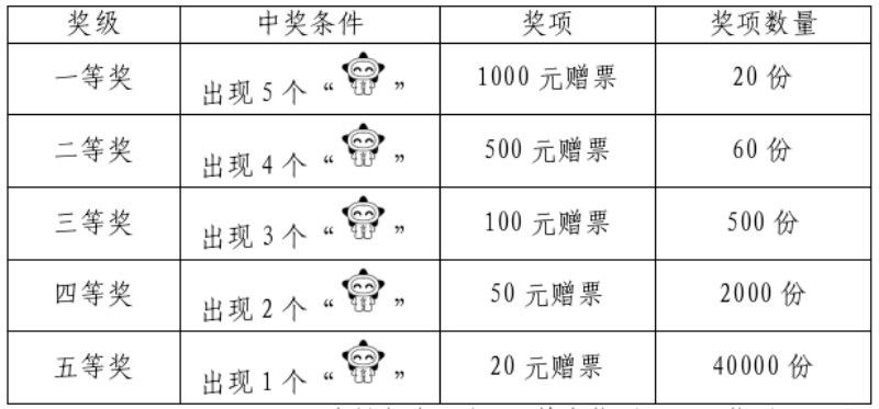 本次活动共设置五个奖级,一至五等奖分别对应为:1000元、500元、100元、50元、20元赠票(赠票不得兑换竞猜型游戏),长票票面营销区共打印8个图形,如当中出现5个“乐小星”标志即中得本次“集星”活动一等奖,可获1000元赠票,具体详见以下表格。