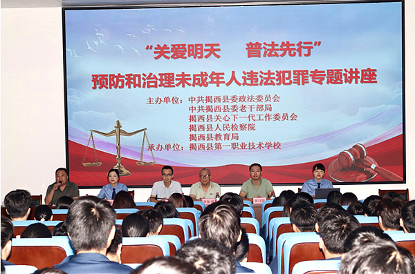 为切实加强未成年人法治教育,有效预防和治理未成年人违法犯罪,10月21日下午,揭西县关工委联合县委政法委、县委老干部局、县检察院、县教育局在揭西县第一职业技术学校开展了一场主题为“关爱明天 普法先行”的普法宣传活动,为在校学生带来了一堂生动且深刻的法治教育课。