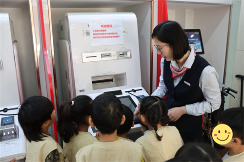 了解了货币的历史与形态,小朋友们迫不及待地进入了下一个环节——银行智能机具体验。在该行工作人员的全程护航下,孩子们分组走近了平日里感觉“神秘”的银行自助设备,特别是自助取款机(ATM)和智能柜台。