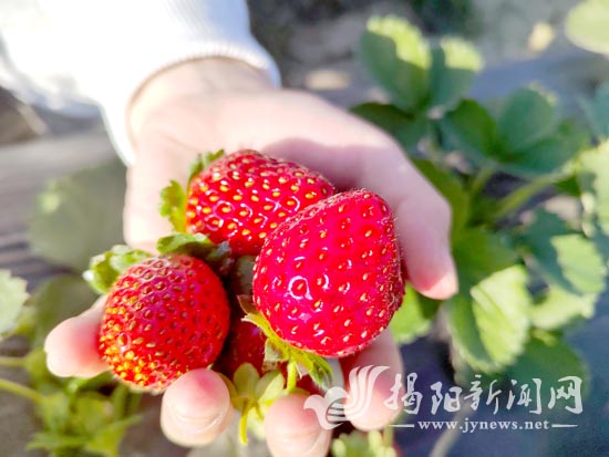 近日,揭东区霖磐镇南塘村的草莓园里,翠绿藤蔓沿田垄肆意铺展,鲜红饱满的草莓错落点缀,清甜果香在空气中悠悠弥漫。市民游客手提篮筐穿梭田间,俯身挑选熟透的草莓,欢快的笑声不时在园中回荡。