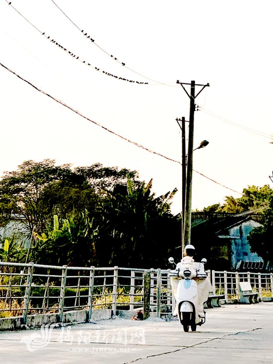 傍晚时分,夕阳的余晖将乡村染成了橙红色,揭东区桂岭镇玉步村村道旁的电线上,燕子密密匝匝地停在上面,既像五线谱上的音符,又像整齐列队的士兵,与电线杆下经过的行人形成一幅有趣的画面。