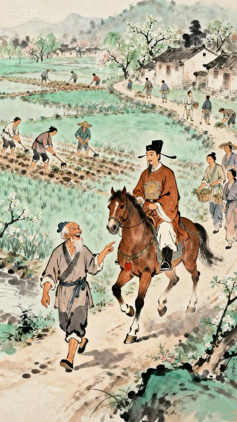 “笑指公家马足忙”,全诗的点睛之笔,以幽默的笔触写出了官民之间的默契与温情。“公家马足”指的是太守的马蹄,老人们笑着指指马蹄,调侃太守为了百姓的农事四处奔波,忙得不可开交。这份“笑指”,没有谄媚,没有疏离,反倒像家人朋友间的打趣,透着浓浓的亲切感。这“忙”,是为了“村村男妇事耕桑”的繁盛;这“笑”,是对太守辛劳的认可,更是对美好生活的满足。一句调侃,让整首诗的烟火气更浓,也让太守的形象愈发亲切可爱。