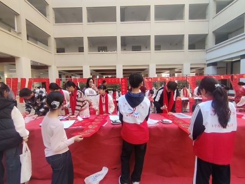 活动由该校师生、校友及家长代表同台挥毫。活动现场,学生们写下一个个或稚嫩或遒劲的“福”字,赢得满堂喝彩;教师们笔走龙蛇,将新春祝福凝于笔端,更将日常教学中“以字养心、以书育人”的理念化为生动的文化实践。现场累计送出春联三百余副,既传递了节日的喜悦,也在笔墨交递中延续文化的薪火。