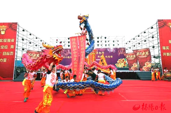 龙是中华民族世代崇拜的图腾,中国人舞龙的历史悠久,已经成为一种传统民俗。舞龙是一项融舞蹈、服饰、音乐、武术于一体的民间独特艺术表演活动。每逢喜庆节日,人们通过舞龙的方式来祈求平安和丰收。揭阳的舞龙起源于明代,在明清时期成为县城重要的节庆活动,甚至延伸到乡间,深受群众欢迎。