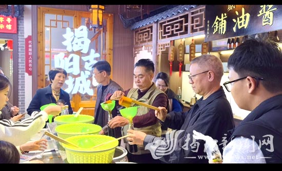 创始于1911年的锦盛酱油,历经五代人传承,始终坚持古法酿造技艺,执守“酱心”传承百年风味。2018年成为广东省非物质文化遗产名录《酱油酿造技艺(揭阳酱油酿造技艺)》传承基地。2025年上榜第一批“广东老字号”。“结合网络热梗并推出‘打酱油’体验来进行‘引流’,目的是希望让更多人走进体验馆,了解揭阳酱油的历史与文化,也为揭阳古城文旅发展贡献力量。”黄桂盛告诉记者,“锦盛酱油”古城店的打造集非遗体验、传承、推广、消费于一体,通过增强与市民游客的互动性、沉浸感,让揭阳酱油的历史底蕴和文化内涵以更亲切可感的形式为更多人所知晓。