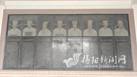 “八贤阁”内设有唐宋“前八贤”——赵德、许申、吴复古、林巽、卢侗、刘允、张夔、王大宝诸位先贤的石刻像座,石刻像座下面记载着八位先贤的生平事迹,每一道刻痕都无声地诉说着他们的卓越学识与家国情怀。继续前行,“励文堂”内的文化宝藏更是令人驻足。堂楼正中央,国家级非物质文化遗产(嵌瓷)代表性传承人、广东省工艺美术大师卢芝高绘制的巨幅《潮州八贤图》(高3米、宽6米)则生动再现了八位先贤的神采风貌,图中八位贤哲衣冠儒雅,各有神态,或坐、或立、或行,人物栩栩如生,呼之欲出。尤为引人注目的是,堂楼之上,新发现的卢侗手书《龙川罗公墓志铭》碑刻被精心重刻展出,字迹清晰,墨香犹存,为研究宋代书法与地方史提供了宝贵实物;此外,当代书法名家崔陟为“励文堂”题写的匾额,以及爱新觉罗·启儒为“扬芳榭”留下的墨宝,更为这座文化殿堂增添了几分当代艺术的光彩。