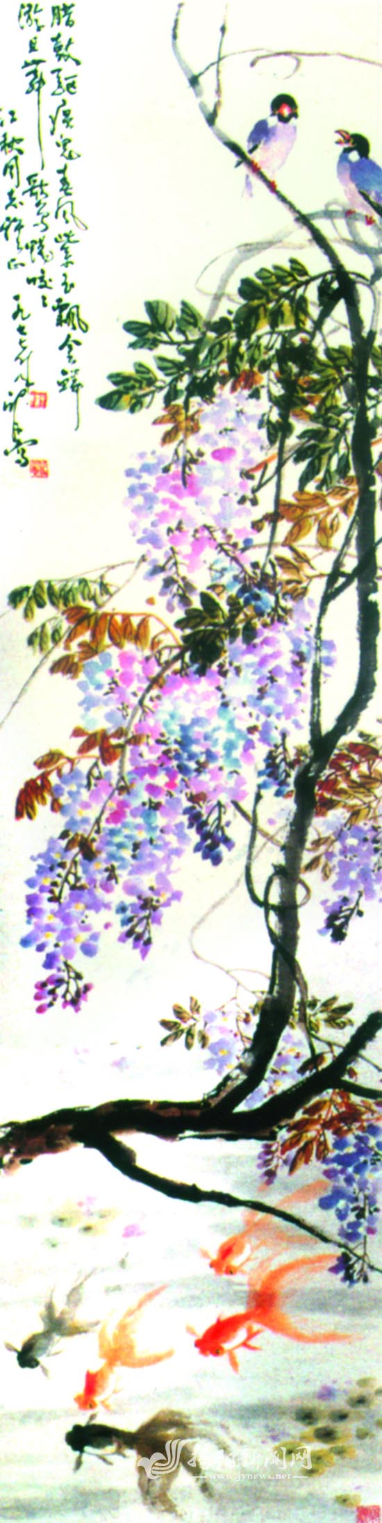 除了画菊,丘及还特别喜欢画紫藤。他的紫藤画作,以草篆入画,采用中锋笔法,用笔如坠石枯藤,笔道的轻重、徐疾、起伏、抑扬、顿挫,富有节奏感,深得吴昌硕先生神韵。诸闻韵先生观其紫藤佳作后,欣然题字:“紫云浮玉拂天风,英杰作画落笔成趣,读竞题识。”寥寥数语,便勾勒出丘及紫藤画作的灵动与韵味,展现了他深厚的笔墨功底和艺术造诣。