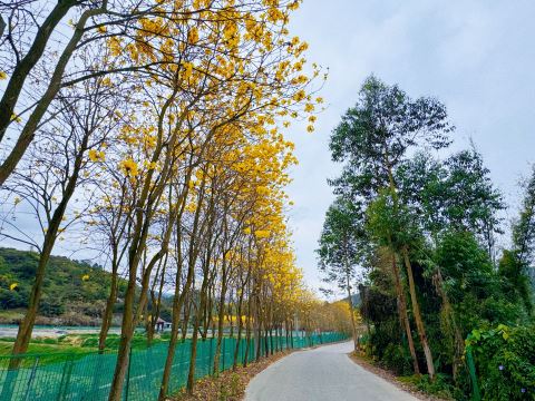 庙角村迎春开放的黄花风铃木与绿植美景相映成趣,是绝佳的拍照打卡地。通讯员 摄