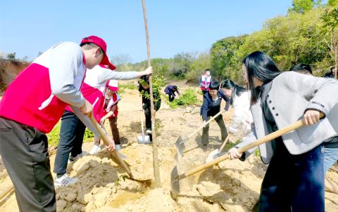 春日的东陇镇石牛山绿美油茶基地阳光和煦、清风拂面,现场一派热火朝天的植树景象。惠来县四套班子领导一到植树点,便拿起铁锹、锄头等工具,与在场的镇村干部、青年志愿者投入到劳动中去。大家在专业农技人员的指导下分工协作、相互配合,挥锹铲土、扶苗填坑、踏土夯苗、提水浇灌……每一个环节都做得细致严谨、一丝不苟。经过一番辛勤劳动,新栽种的100株翡翠青柚和1100株红花油茶错落有致、傲然挺立,为初春的石牛山增添了盎然新绿。