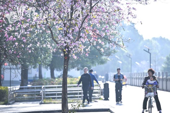 近日,揭东城区滨江路紫荆花迎来盛花期,繁花满枝、粉艳动人,将沿江道路装扮成浪漫花廊。优美整洁的城市环境吸引不少行人驻足观赏,运动中的市民在花香中尽享春日美景,感受绿美揭东生态建设带来的宜居新风貌,处处洋溢着温馨惬意的生活气息。林碧鸿 文 邢永琪 摄