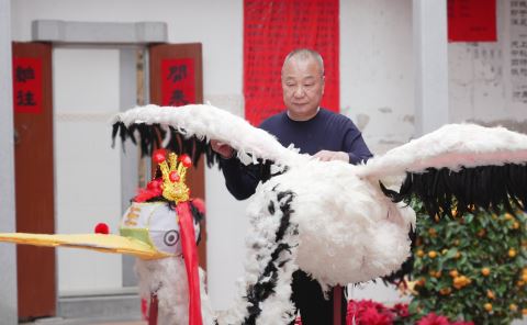 鹤舞市级代表性传承人苏华煜正在检查鹤灯。