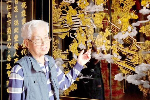在演示金漆画的制作技法,谈及金漆画的独特魅力之时,年近80岁的李舜浑身散发着非遗传承人特有的自信与从容。李舜与金漆画的缘分来源于家庭的影响,他的父亲李毅正16岁便向清末民初普宁有名的漆艺大师李孝丹拜师学艺,后来又与著名的工艺美术大师陈晨光结为异姓兄弟,他们搭档合作,常常在古建装饰竞争市场中胜出。“我小时候常常跟随爸爸、晨光叔他们去祠堂工地,看他们作画、油漆,就觉得很有趣。”李舜说。1968年,高中毕业的李舜因特殊年代中断学业,回家跟随父亲学艺,随后拜师陈晨光,正式踏上漆艺之路。