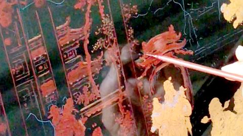 作画时,用钛白粉勾勒轮廓,以生漆调制的金地漆描绘纹样,待漆将干未干之时,以毛笔轻蘸金粉敷贴,除了平铺,还有渐变,即以格纸、棉花团晕染金银粉,通过明暗深浅变化塑造虚实效果,强化立体感与空间层次感。随后,要使用特制的铁线笔,在扫好金的平面上精细地进行刻画,能展现出人物服饰的精致图案、袍铠的细腻纹理等,使得画面更加细腻生动,这也是金漆画在描金漆工艺中最具特色的造型手法。接下来,再用乌漆修洗,衬托出前后光暗,使画面富有立体空间感。最后,还要在画面上均匀薄髹一层明熟漆,以增强金漆画的耐腐蚀性和耐磨性。这样,即使历经数十年甚至上百年,金漆画仍能保持完好如初,这也是金漆画独有的魅力所在。
