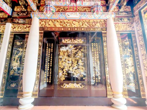 在潮汕地区,金漆画与金漆木雕往往相融共生,有“有木必雕,有雕必金”的说法,广泛应用于神庙、祠堂、古民居等建筑构件以及祭祀用品、家具等日用品的装饰。
