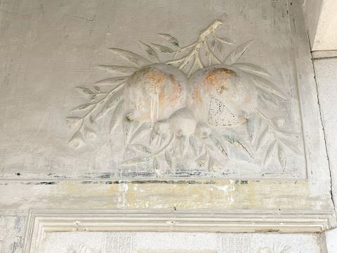 勤修公祠墙壁上装饰有“石榴”图案,石榴连枝带叶,切开一角,露出累累果实,谓之“榴开百子”,象征子孙繁盛。石榴上刻着“象贤”两字。