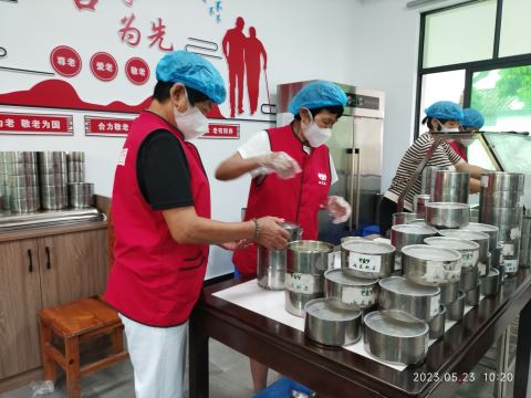 近日,记者来到位于普宁市流沙兰花苑的雨花敬老家园,只见身穿红马甲的志愿者们正在忙碌穿梭着:有的正在准备餐具装菜上饭,有的正在把装满饭菜的餐具(饭盒)等装上送餐车,还有的正在帮忙洗菜切菜做饭等(见下图。通讯员 摄)。