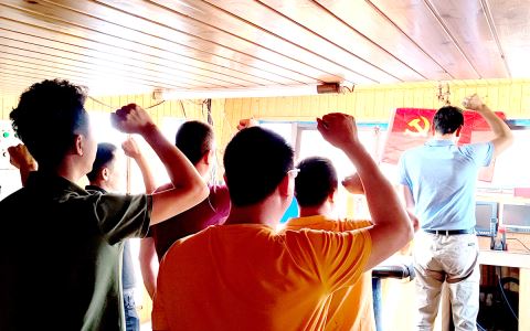 4月23日,在“粤惠来渔43856”渔船的木质甲板上,在神泉镇澳角村海上渔船党支部书记带领下,澳角村全体渔民党员,面对鲜红党旗,紧握右拳,庄严肃立,重温入党誓词。