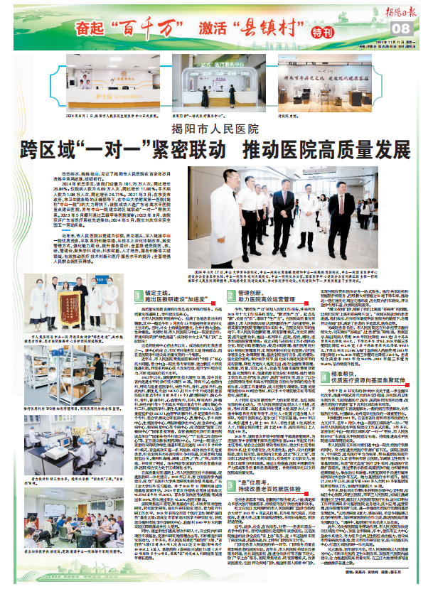 此外,为发挥医院辐射带动作用,市人民医院加快建设区域医疗中心,加强全市胸痛、卒中、创伤等五大中心急救体系建设,努力提升公共卫生防控救治能力,建设城市传染病救治基地,建设市级科研实验室、临床技能实践中心,打造区域医教研一体化高地。