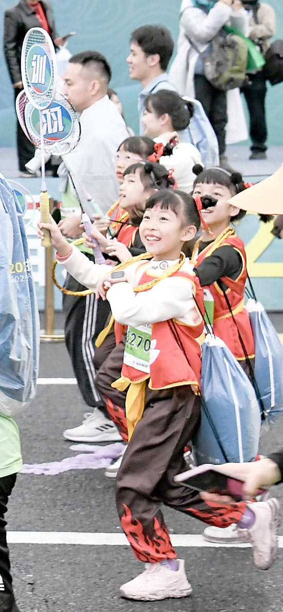 揭阳马拉松赛不仅是一场体育竞技的盛会,更是一次文化交流的盛宴。当天,赛道沿途设置了40个表演点60个节目共1300多人为赛事添彩。在欢乐跑终点,揭阳小狮妹林熙悦带领喜悦醒狮队的少年们,以激情四射的醒狮表演,为这场体育盛事增添了浓厚的文化氛围。少年们双手稳稳握住狮头,跟着激昂的鼓点,灵活地跳跃、转身,每一个动作都充满了力量与气势,让人沉浸其中。林熙悦说:“能为跑友们加油鼓劲,非常有意义。希望借助这次展示,让更多同龄人了解舞狮,爱上舞狮。”