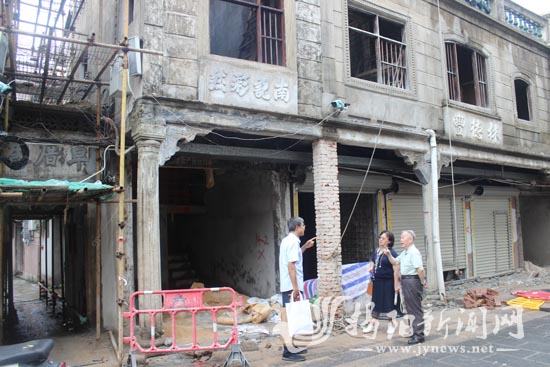 蔡穗虹(中)、刘特正(右)和方羽生在刘桐发京果铺旧址前。阿 龙 摄