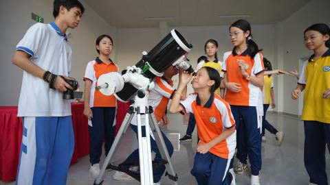 学生们通过天文望远镜,感受科技魅力。杨小琪 摄