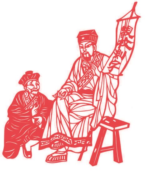 这幅《十五贯》作品刻画了坐在凳子上的清官况钟化装成拆字先生微服私访,一手捋着胡子,一手扳着指头;尖嘴猴腮的娄阿鼠蹲在下方,露出惊慌失措的神态。画面上通过人物的手势、动态配合,刻画心理变化,又分别用“阳”与“阴”剪,隐喻正与邪,线条与块面的处理,既使疏与密形成强烈对比,又“绘”出衣饰纹理的变化,而不是简单地用几条线来连接,妙在其中。