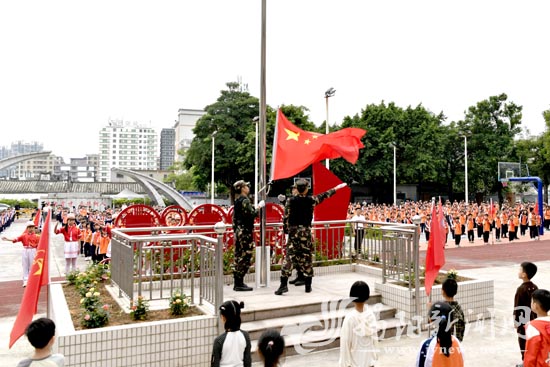 当天上午8时20分,清晨的阳光洒满校园,照亮了师生们期盼的脸庞。军跃教育国旗护卫队迈着整齐而坚定的步伐走向升旗台。他们身姿挺拔如松,眼神坚毅似铁,每一步都精准有力,尽显对祖国的热爱与忠诚。激昂的国歌声中,鲜艳的五星红旗冉冉升起,迎风招展。全体师生庄严肃立,向国旗行注目礼,高唱国歌,歌声中饱含着对祖国的无限敬意。有学生激动地说:“国旗护卫队队员们的风采太让人震撼了,升旗仪式的神圣与肃穆,让我真切感受到了祖国的强大,我要以他们为榜样,努力成长为爱国担当的少年。”