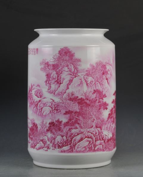 陶瓷山水画是国画技法在陶瓷材质上的表现,它以陶瓷材质为载体,以陶瓷的釉、颜料为表现手段,以陶瓷特有的技法来表现国画的意趣,表达思想情感,将国画的精髓融入陶瓷之中。今欣赏的潮彩玛瑙红纹筒瓶《万壑树木参天》创作于2005年,2007年在第三届中国(深圳)文博会上获“中国工艺美术文化创意奖”金奖, 2008年入藏广东民间工艺博物馆,作者是广东省工艺美术大师、潮州彩瓷省级非遗代表性传承人蔡禧平。