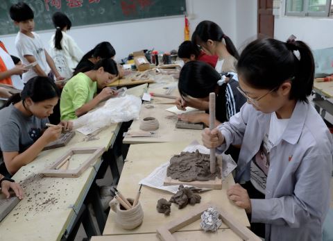 近年来,这所创办于1967年的乡镇中学,以“非遗传承”为切入点,将陶艺砖雕、剪纸书法等传统文化瑰宝融入课堂,构建起“五育并举”的特色育人体系,让沉寂的泥土与纸张在校园焕发出蓬勃生命力。