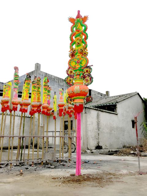 冬日,走进揭西县钱坑镇钱西村福源香厂,一根根高达6米的大龙香整齐陈列,手工雕琢的立体龙纹盘绕其上,活灵活现。晒场上,数十根笔直的竹竿架在木架上。福源香业第四代传承人林少潮跟在儿子林粤雄身边指点着,后者正用指尖捻起一团米白色香粉,仔细填补着大龙香雏形上的纹路。