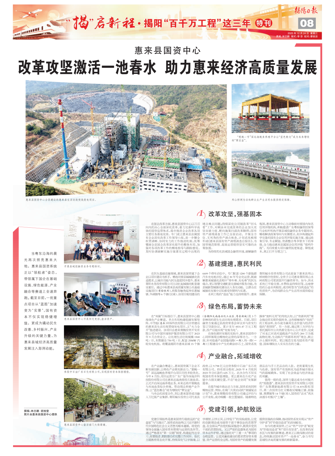 当粤东沿海的晨光再次照亮惠来大地,惠来县国资系统正以“领航者”姿态,带领属下国企在基础设施、绿色能源、产业融合等赛道上全速奔跑。截至目前,一批重点项目从“蓝图”加速变为“实景”,国有资本不仅实现稳健增值,更成为撬动民生改善、乡村振兴、产业升级的关键力量,为惠来县域经济高质量发展注入澎湃动能。
