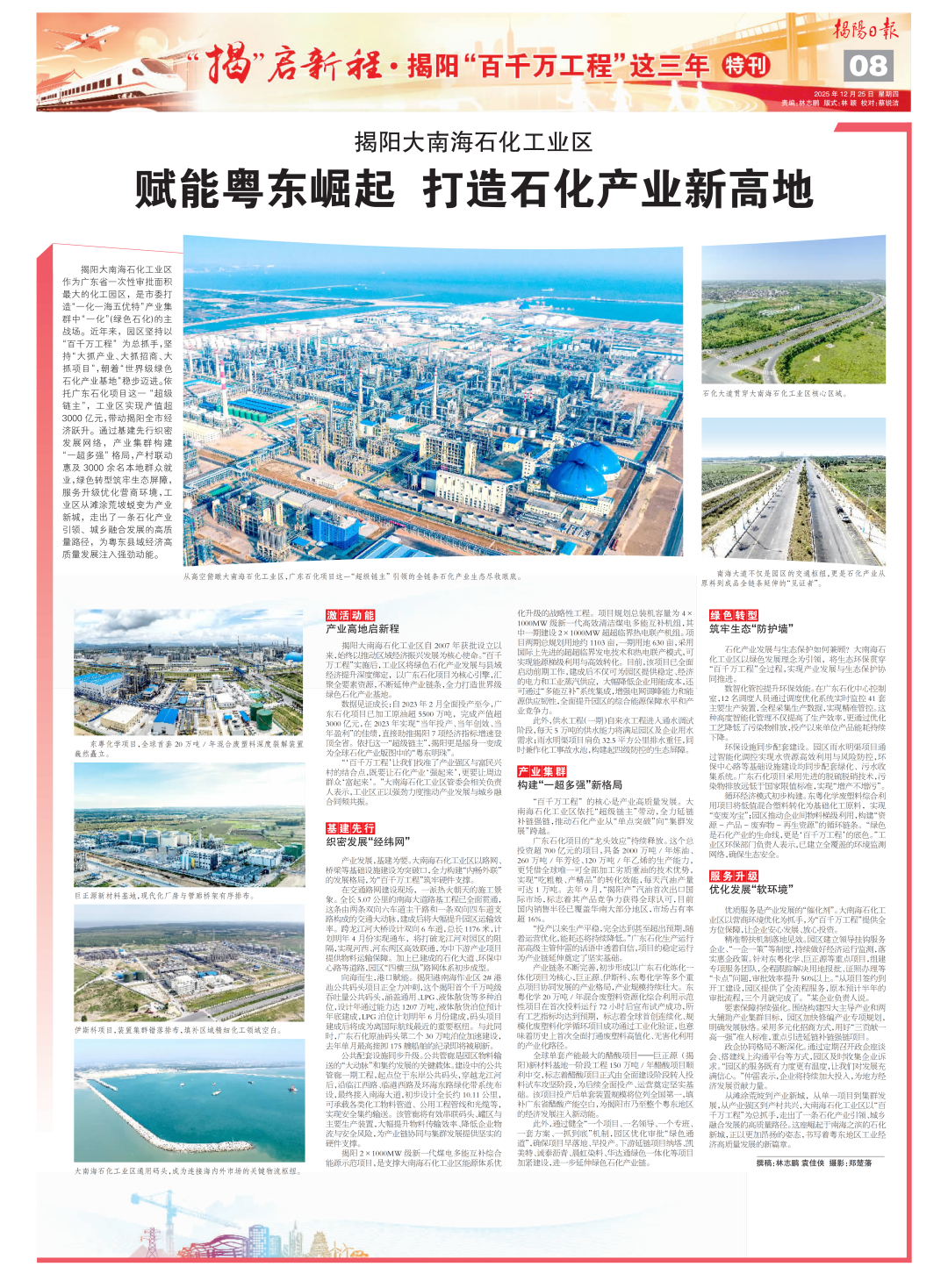 揭阳大南海石化工业区自2007年获批设立以来,始终以推动区域经济振兴发展为核心使命。“百千万工程”实施后,工业区将绿色石化产业发展与县域经济提升深度绑定,以广东石化项目为核心引擎,汇聚全要素资源,不断延伸产业链条,全力打造世界级绿色石化产业基地。