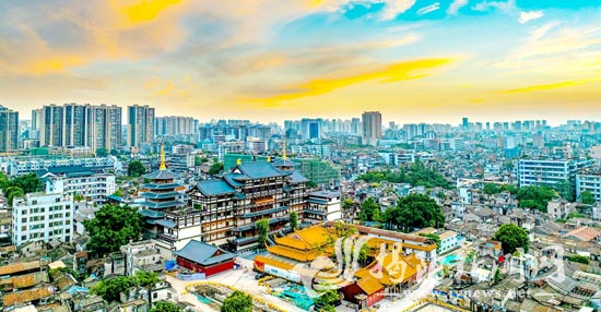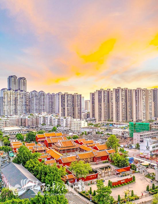 朝霞映照下的揭阳古城,双峰寺、揭阳学宫等古建筑与现代民居交相辉映,古城保育活化让历史文化街区焕发新的生机,尽显古今交融之美。