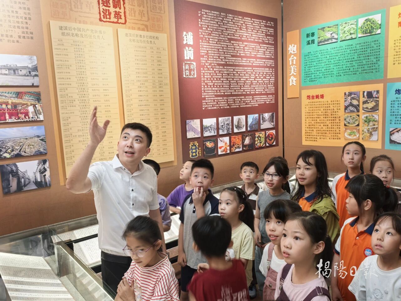 炮台镇新寨乡史馆内,讲解员带领孩子们参观本土文化展板,沉浸式了解家乡文化。