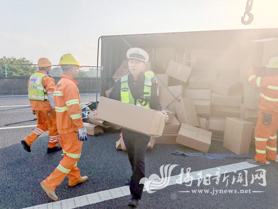 当天15时20分,揭阳交警高速二大队接到群众报称:在甬莞高速K1214+000往惠州方向发生一起两辆货车追尾事故,事故导致一车侧翻,车载货物大量散落,路面被阻断,急需救援。接警后,民警迅速前往处置,并通知路政、拯救、养护等多部门参与救援(见图。通讯员 摄)。