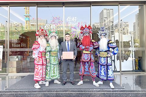 陈金渠把金总好礼·英歌舞文创礼品送给到桂表演的普宁英歌队队员。