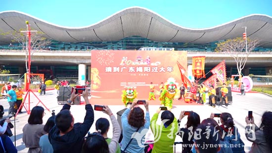 锣鼓喧天,青狮献瑞,英歌巡场,潮剧悠扬……13日,“请到揭阳过大年”文旅推介活动暨揭阳市旅游集散中心建成对外开放仪式在揭阳潮汕国际机场热闹举行,让广大旅客感受揭阳非遗的独特魅力(见图。杨小琪 摄),诚邀大家到揭阳“逛古城、学武术、看英歌、购美玉、品美食”。