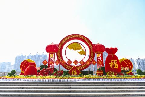 市区临江北路的春节主题花卉造型格外靓丽,营造出浓浓的节日氛围。