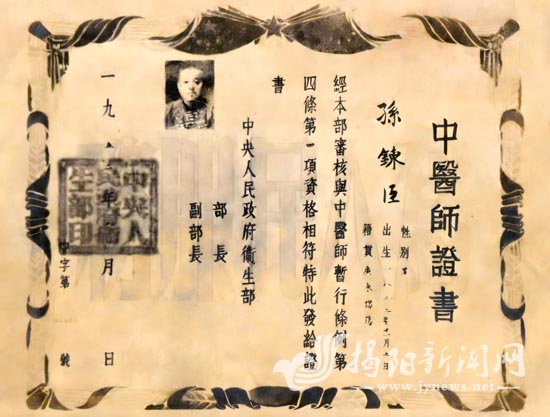 1951年8月,中央人民政府卫生部发予孙鍊臣《中医师证书》。