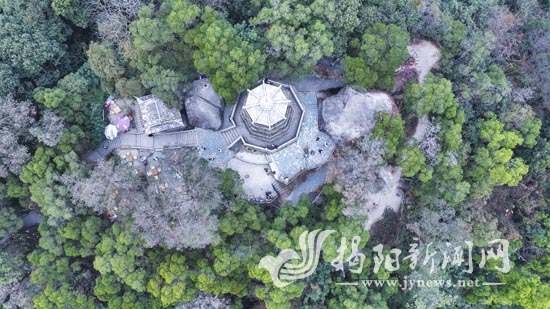 岐山古塔矗立在翠绿丛中,与远处日新月异的揭阳城区风光相映成趣。