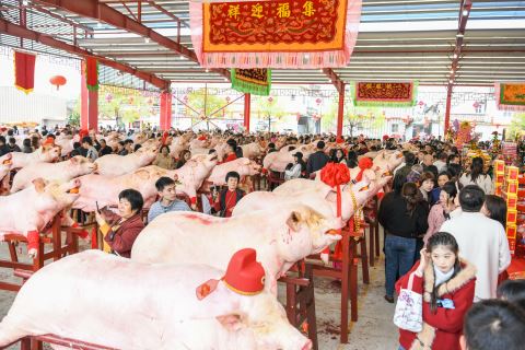 活动中,硕联村南社到处张灯结彩,数百头精心装扮过的公猪、公羊整齐摆放在特制的木架上,场面蔚为壮观,吸引了全国各地游客前来观赏。“摆猪羊”这一民俗活动至今已有500多年历史,由硕联村十个自然村(十社)轮流主办,每个自然村十年轮到一次当值。 何小妍 文 郑楚藩 摄