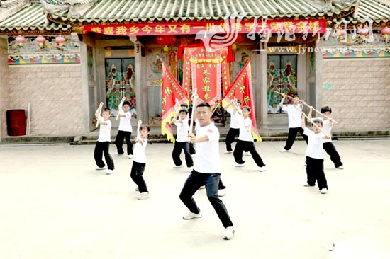 该武术队积极参加“乡乡乐”巡演等当地的群众文化活动,广受赞誉。近年来,在相关主管部门的大力支持下,他们以鸿江侯氏宗祠为培训基地,面向邻近乡村青少年开展免费公益培训,促进朱家教拳的传承发展;特别是将朱家教拳引入校园,创编了功夫扇校园武术课间操,用《男儿当自强》曲调为背景音乐,在当地鸿江小学推广。